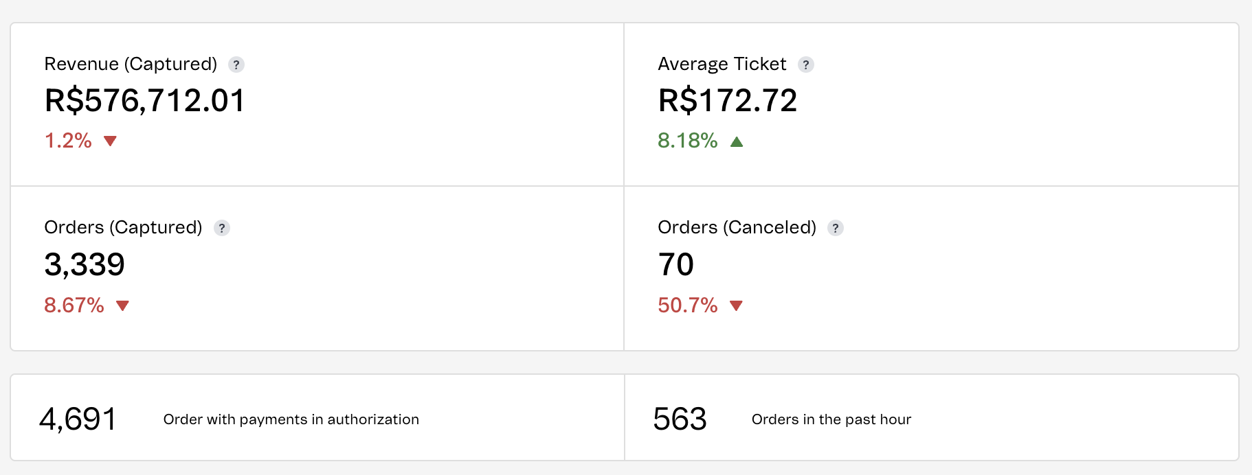 | Orders with payment in authorization | Orders that have not been placed due to payment authorization issues. By clicking on this metric, you are redirected to the Transactions page to review pending payment authorizations. |