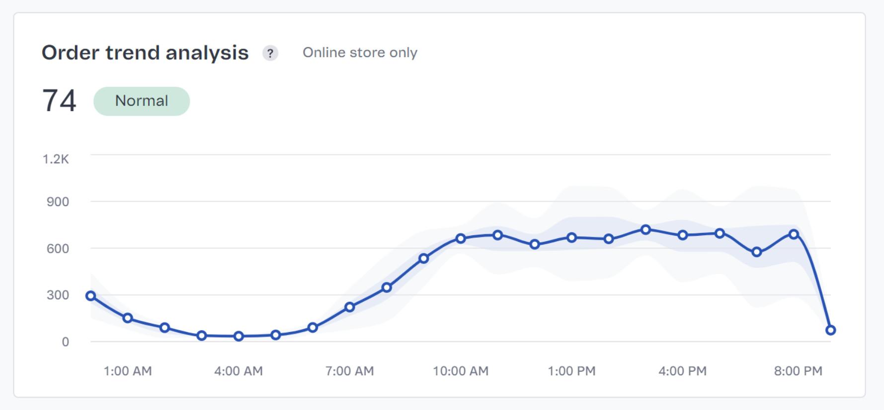 The number shown on top of the chart refers to the orders placed in the last hour and it is updated every five minutes. The label on top of the chart indicates whether orders are being placed at a normal, low or high rate when compared to your store’s usual performance for that period.