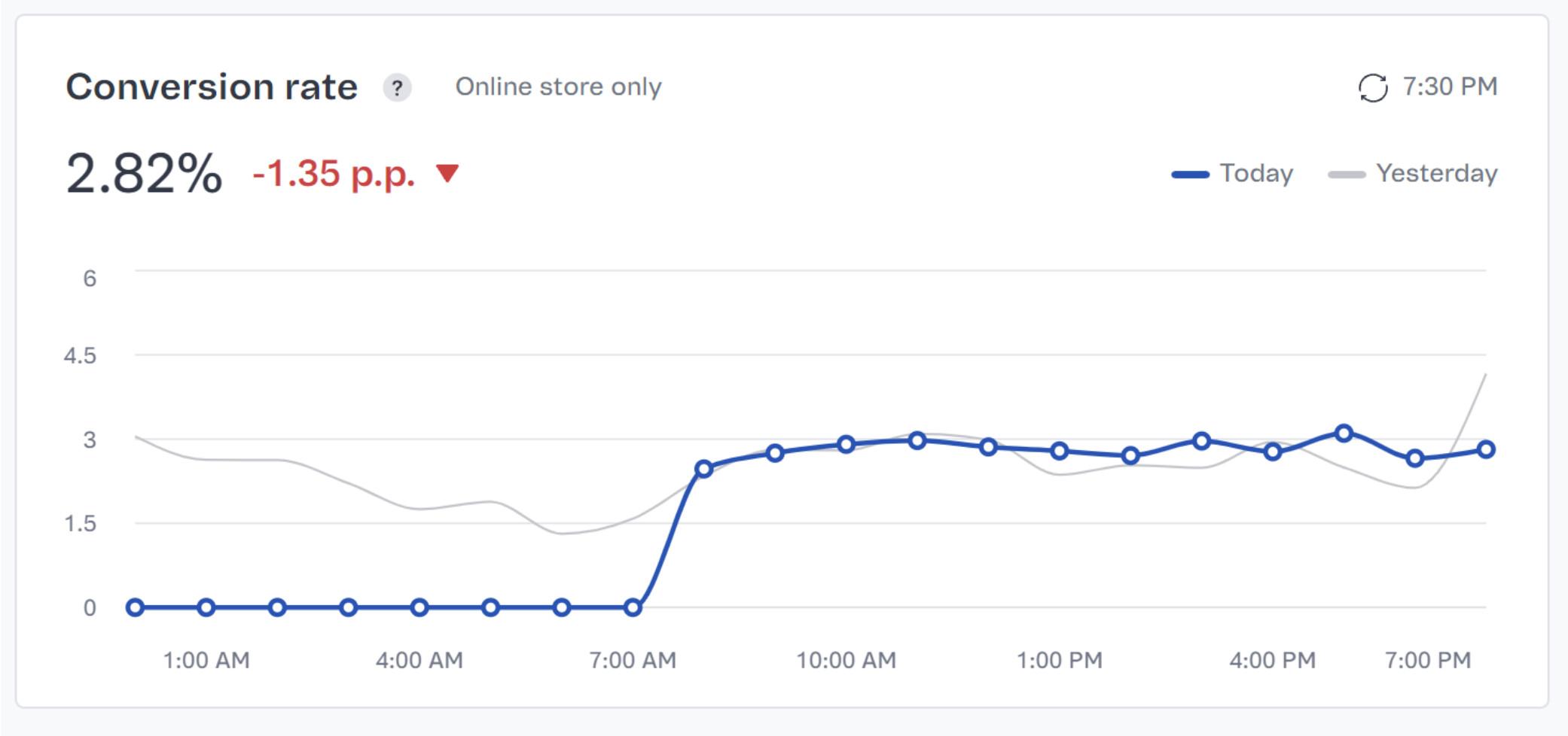 This chart shows your store’s conversion rate in the selected periods you wish to compare. The conversion rate is calculated by dividing the total number of orders by the total number of sessions in your store. The thick blue line indicates the conversion rate for the most recent period. The thin blue line indicates the conversion rate for the the period selected for comparison. The chart also indicates the percentage (%) and percentual points (p.p) of increase or decrease for this metric. By hovering the mouse over the chart, you can see the value of that metric at specific times.