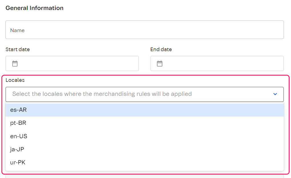 After installing the VTEX Intelligent Search: Multilanguage, the page for creating or editing Merchandising Rules — available on VTEX Admin through Storefront > Intelligent Search > Merchandising rules — will contain the additional Locales field, which allows you to choose the locales to which the Merchandising Rules will apply, as shown in the image below.