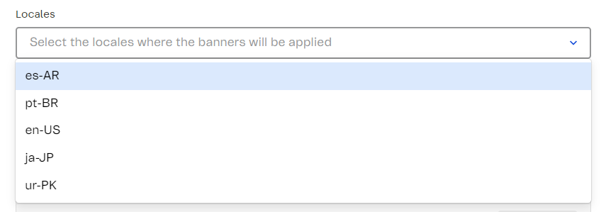 After installing the VTEX Intelligent Search: Multilanguage, the page for creating or editing Banners — available on VTEX Admin through Storefront > Banners — will contain the additional Locales field, which allows you to choose which locales the Banners will apply to, as illustrated in the image below. Click on the languages you want to select.