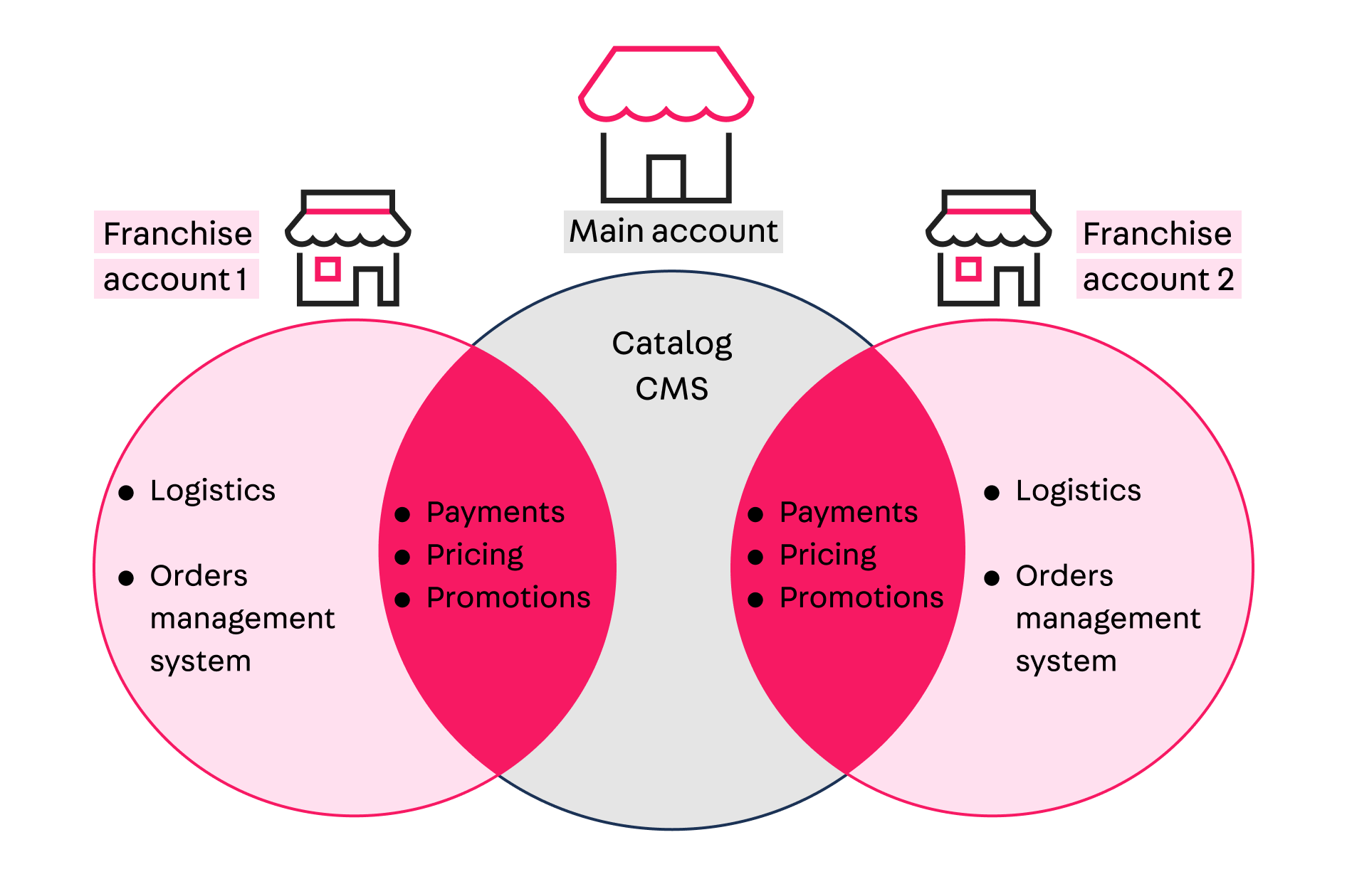 The franchise account inherits the Catalog from the main account, but it has its own Logistics and performs its own Order Management, so that the physical store can manage the orders and deliver the products.