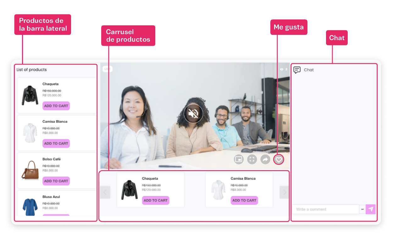 - Carrusel de productos: muestra un carrusel con una colección de productos en una vista horizontal debajo del reproductor de video durante el evento en vivo.
