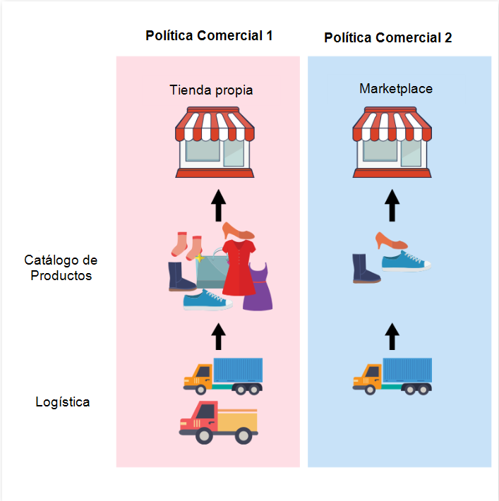 La misma política comercial puede ser utilizada por más de un marketplace o entre tienda principal y marketplace. Para esto, basta con utilizar el mismo ID de política comercial en la configuración. Al hacer esto, se utilizará el mismo catálogo y la misma logística para las tiendas o canales que están configurados con la misma política comercial.