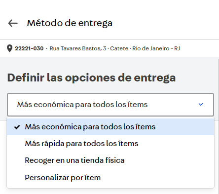 La siguiente pantalla muestra las opciones de entrega. Como VTEX Sales App tiene acceso al stock de varias tiendas, existen varias posibilidades para organizar la entrega, dependiendo de dónde se encuentren los productos en el carrito.