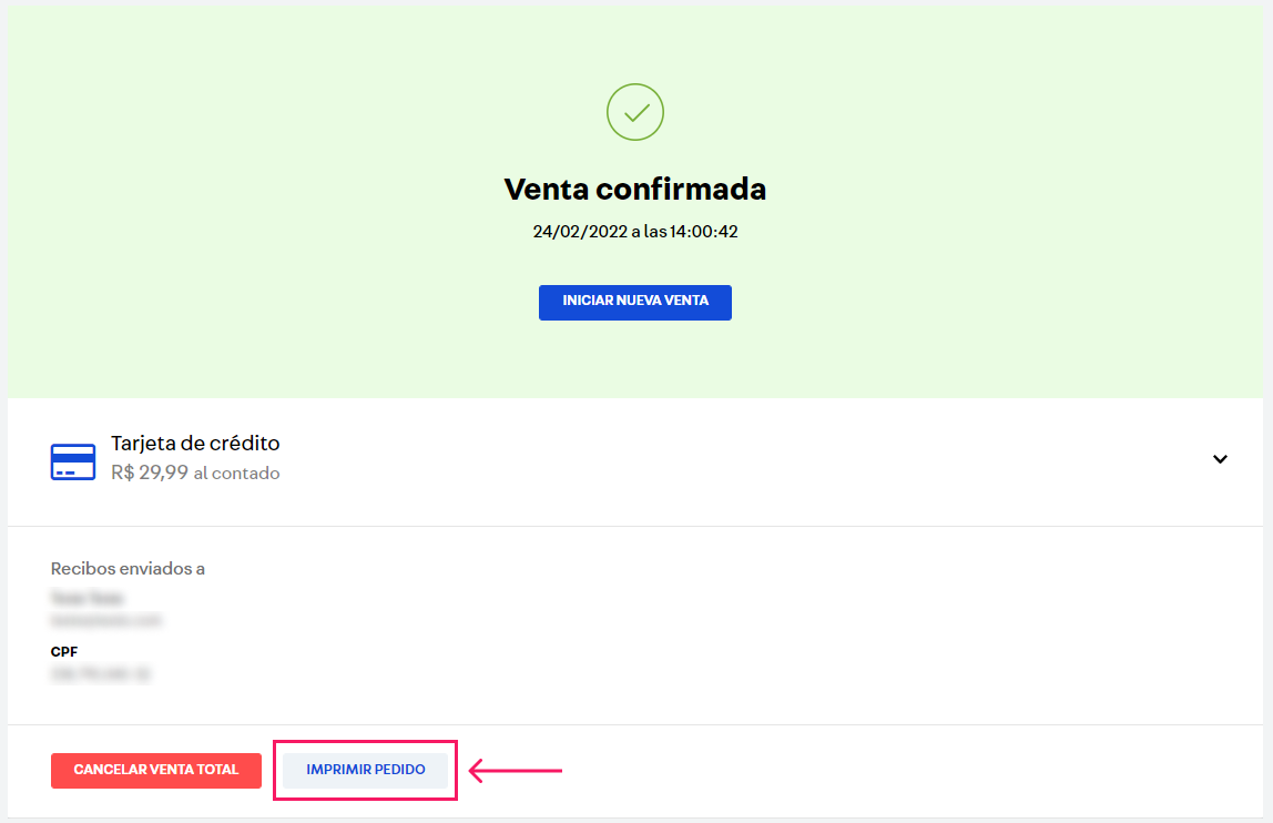 Para ello, el vendedor puede hacer clic en el botón Imprimir pedido en la pantalla del pedido finalizado, como se ilustra a continuación. Otra opción es configurar VTEX Sales App para que imprima el resumen del pedido automáticamente en cuanto se finalice el pedido.
