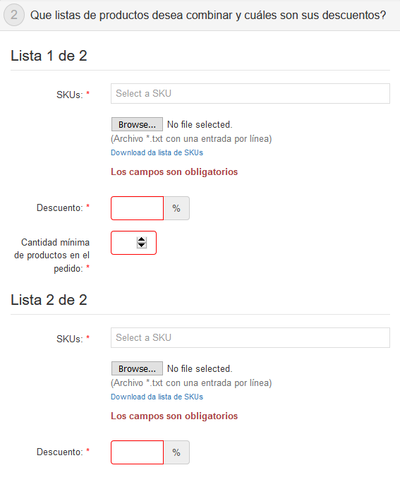 La pantalla de configuración de la promoción ofrece dos listas de SKUs, que pueden añadirse manualmente o por plantilla.