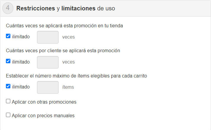 Después de rellenar todos los campos de una promoción regular con descuento porcentual, puede seleccionar la opción Definir la cantidad máxima de ítems afectados por carrito en la sección Restricciones y limitaciones de uso.