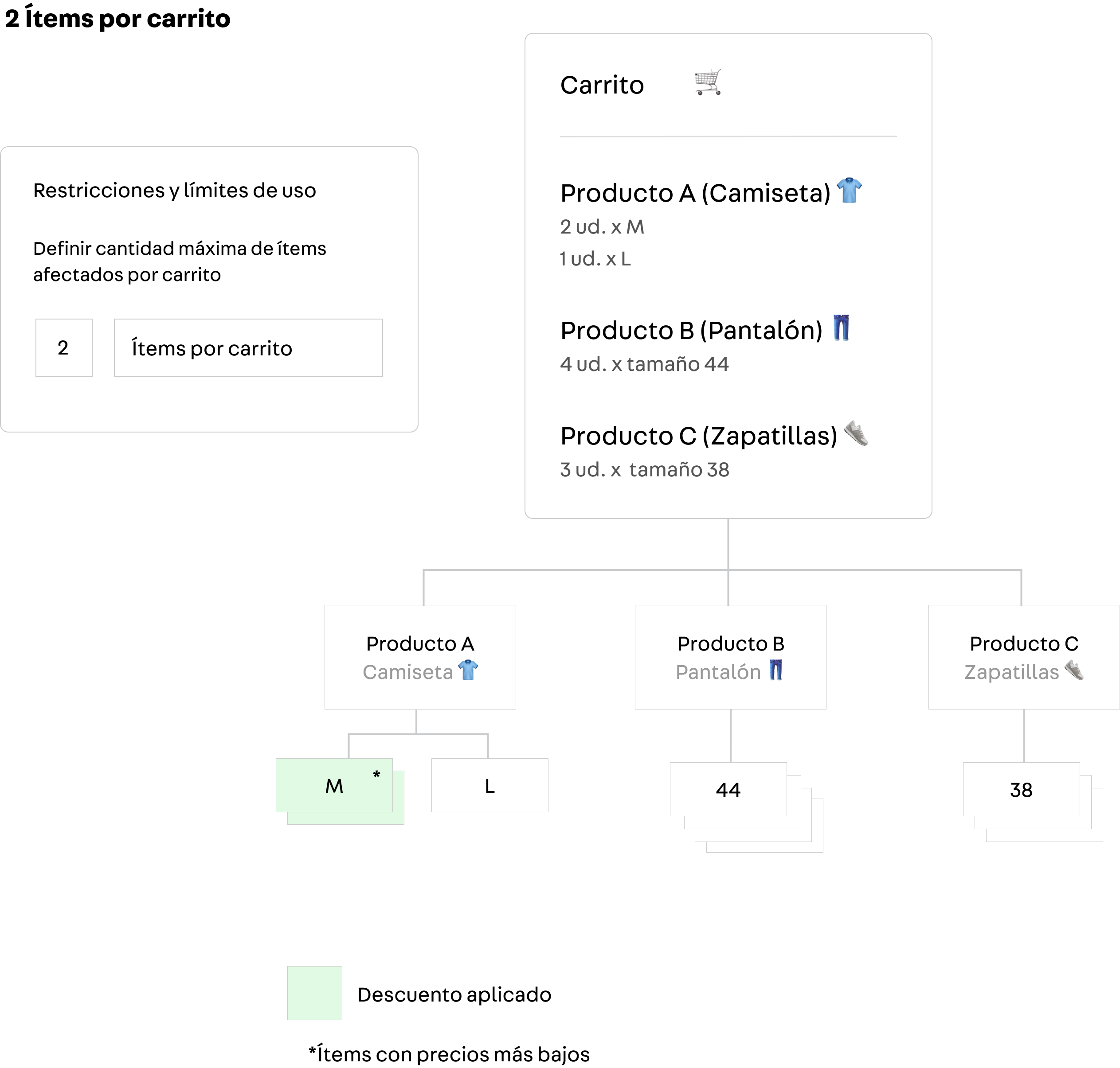 Por defecto, la opción ilimitado está activa, aplicando la promoción a todos los ítems del carrito, como se ilustra en el siguiente diagrama: