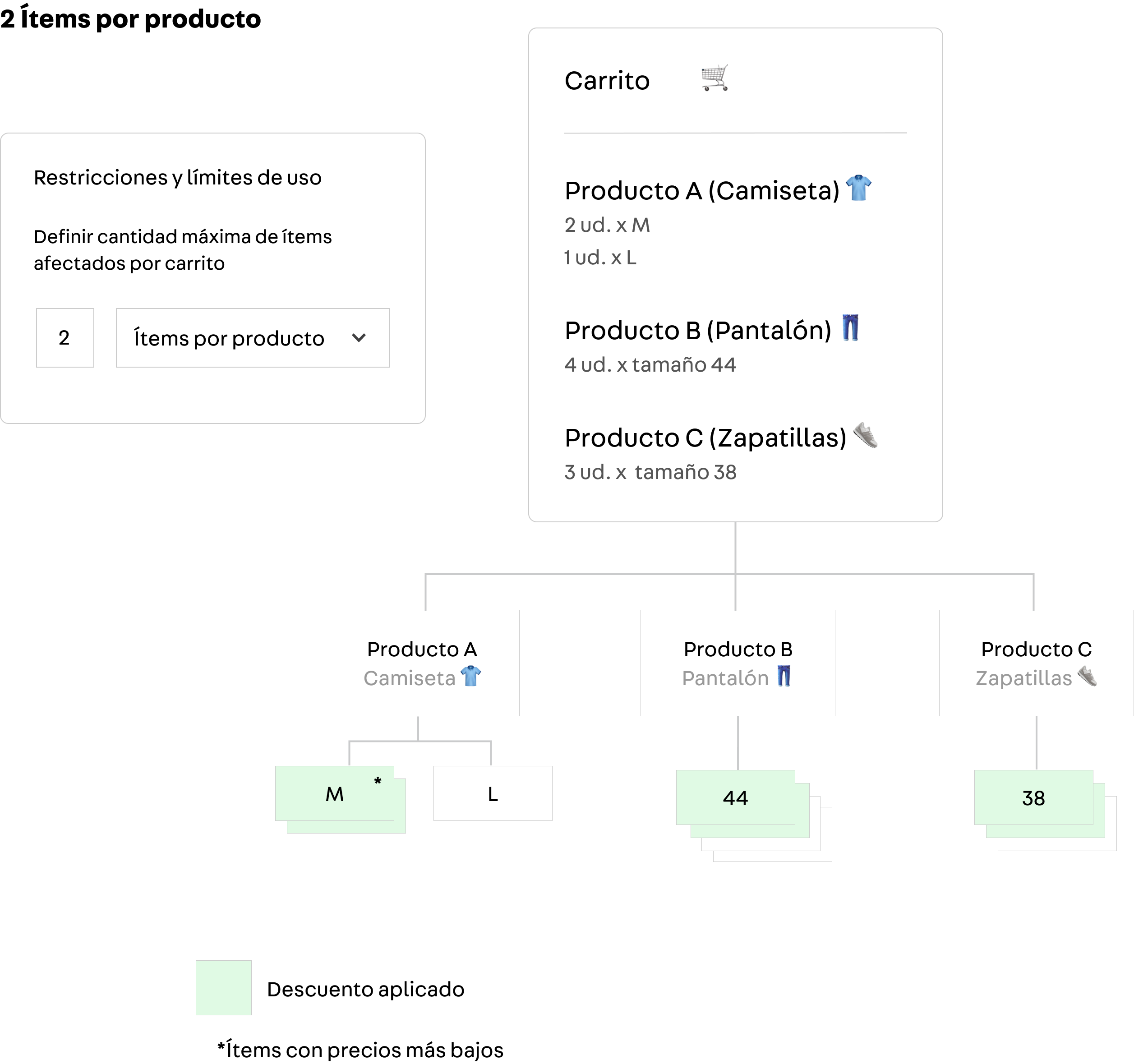 - Ítems por producto: esta configuración limita la promoción a un número de unidades de cada producto. Como en el siguiente ejemplo, apenas dos unidades por producto serán elegibles para la promoción. El precio más bajo define qué ítems de cada producto son elegibles para la promoción.