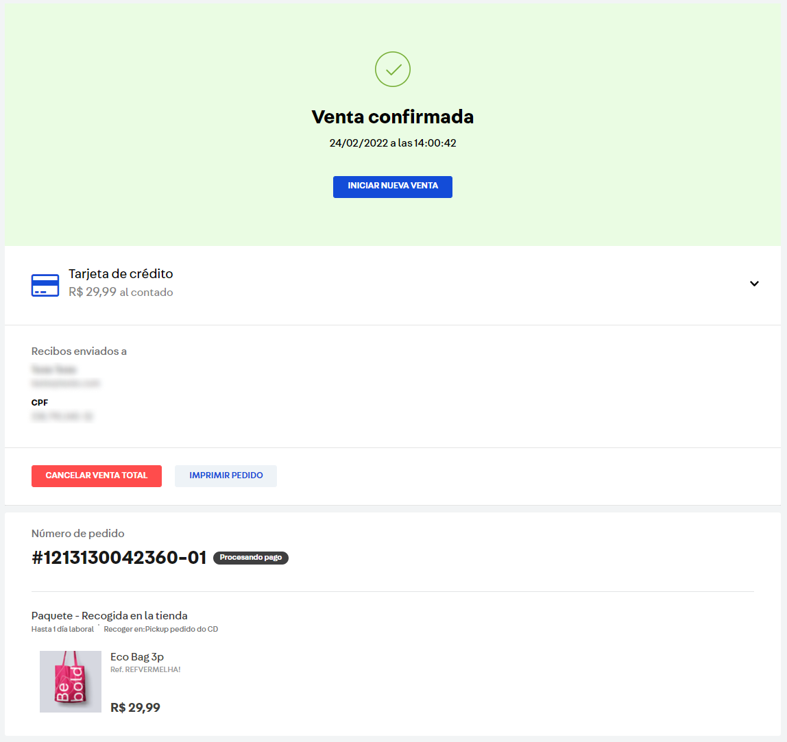 El vendedor puede ver la pantalla Venta confirmada con el resumen del pedido cuando termina una venta, o haciendo clic en una venta en la página Últimas ventas, a la que puede acceder a través del menú principal de VTEX Sales App. En la página Últimas ventas, pueden buscar el pedido por número de pedido o nombre del cliente.