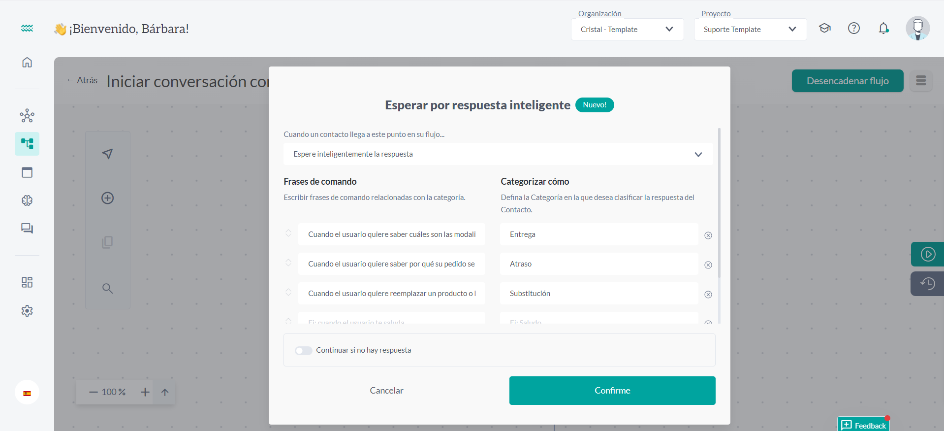 Con la tarjeta "" Esperar por respuesta inteligente"", puede esperar la respuesta del usuario y enviar esa respuesta directamente a su Clasificación de IA, de modo que pueda crear sus categorías y tratar cada intención según desee: