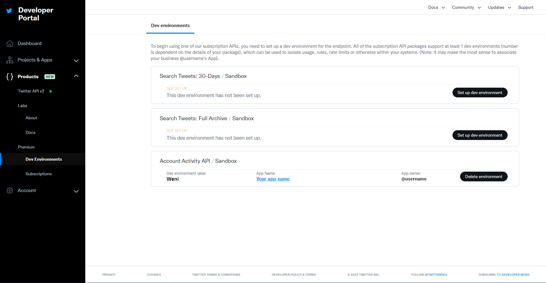 Luego, deberás crear un entorno de desarrollo para que tu aplicación se ejecute. Deberás crear un entorno para la Account Activity API / Sandbox. Puedes nombrarlo como desees; recomendamos ""producción."" Asegúrate de seleccionar la aplicación que creaste en esta etapa. Este nombre se usará al conectar la cuenta en la Plataforma Weni.