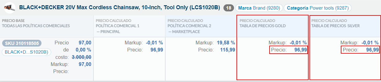 Después de crear sus tablas de precio, puede ver el precio de cada producto de la tienda separado por tabla de precio, al igual que sucede con las políticas comerciales.