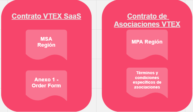 El contrato VTEX o acuerdo comercial consta de dos partes, el MSA (Master Service Agreement) y el Anexo 1 Order Form para la prestación de servicios a empresas o MPA (Master Partner Agreement) y Términos y condiciones específicos de la asociación.