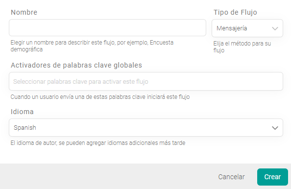 - Después de eso, un pop-up para creación de flujo aparecerá en si pantalla. Esta esta formada por 4 campos que pueden ser llenados: Nombre , Activadores de palabras clave globales , Idioma, Tipo de Flujo.