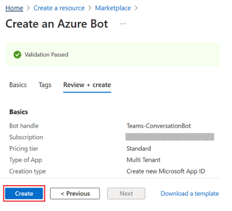- Selecciona Crear si la validación es aprobada. Tomará unos momentos para que tu servicio de bot sea aprovisionado.