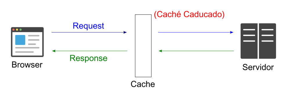 El cache está representado a través de una capa entre el browser y el servidor y, así, cuando un request ocurre, en vez del sistema ir a buscar la información directamente en el servidor, primero va a esa capa, lo que vuelve mucho más ágil a la respuesta. Vea el esquema abajo: