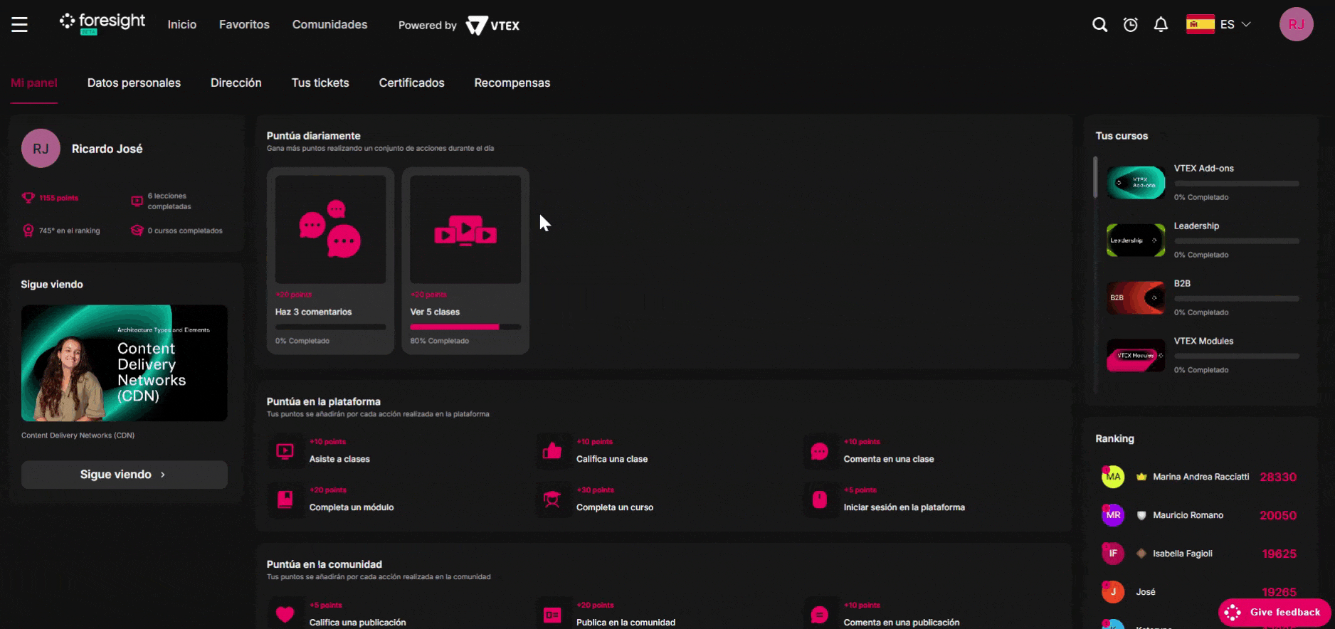 - Puntos en la plataforma: realiza actividades como ver o evaluar una lección.