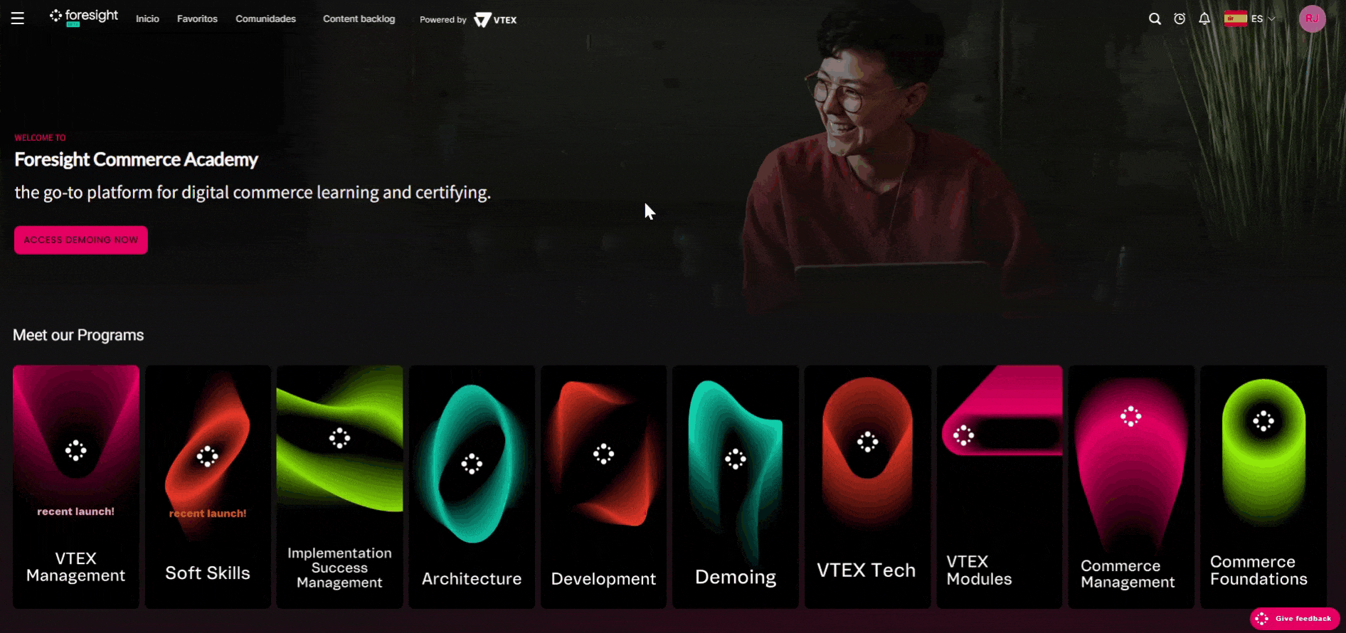 Foresight Commerce Academy es una plataforma educativa diseñada por VTEX destinada a compartir conocimientos sobre diversos temas relacionados con los negocios, la arquitectura y la tecnología VTEX.