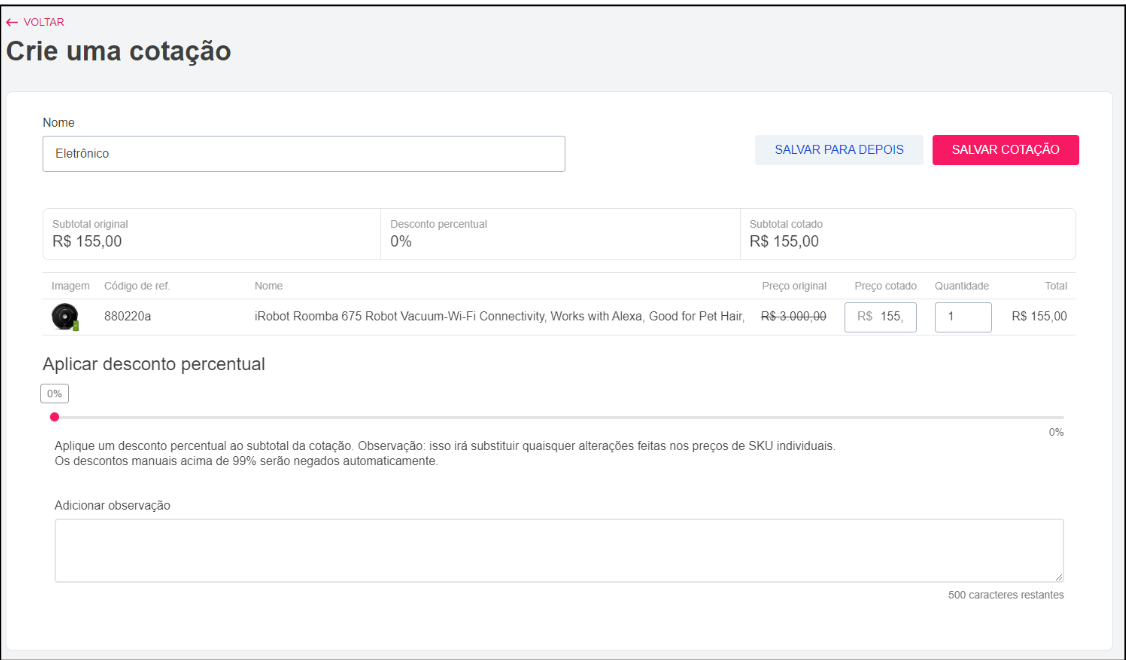- Agregar observación: campo opcional para ingresar comentarios u observaciones. Las observaciones aquí añadidas serán visibles como parte del Historial de actualizaciones de la cotización o carrito guardado. Por ejemplo, si un usuario quiere solicitar un descuento específico al vendedor de la tienda B2B, puede incluir esta solicitud como observación.