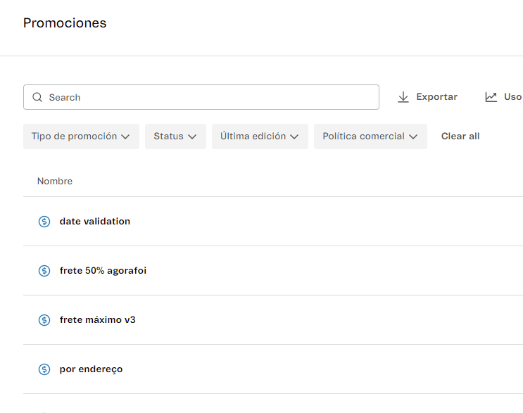 Puedes descargar un archivo CSV con las promociones registradas en tu tienda y su respectiva información. Para descargarlas, haz clic en el botón 📥 Exportar, al lado de la barra de búsqueda. El archivo exportado considera los filtros aplicados a la lista y no incluye las promociones archivadas.