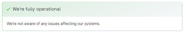 Esta sección te permite ver el status general de la plataforma: fully operational (completamente operativa), experiencing issues (experimentando problemas) o undergoing maintenance (mantenimiento en curso).