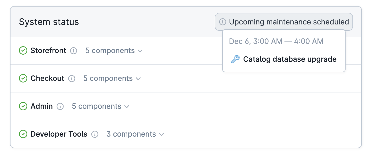 Si se trata de un mantenimiento programado para una fecha futura, también verás el botón Upcoming maintenance scheduled, como se ilustra a continuación. Al pasar el mouse sobre el botón, se mostrará el evento de mantenimiento programado. Puedes hacer clic en el evento para ver su registro.