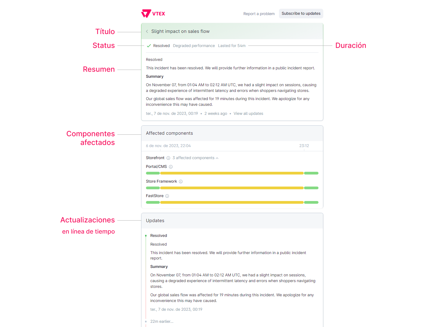 - Actualizaciones: línea de tiempo con las actualizaciones y cambios de status del incidente.