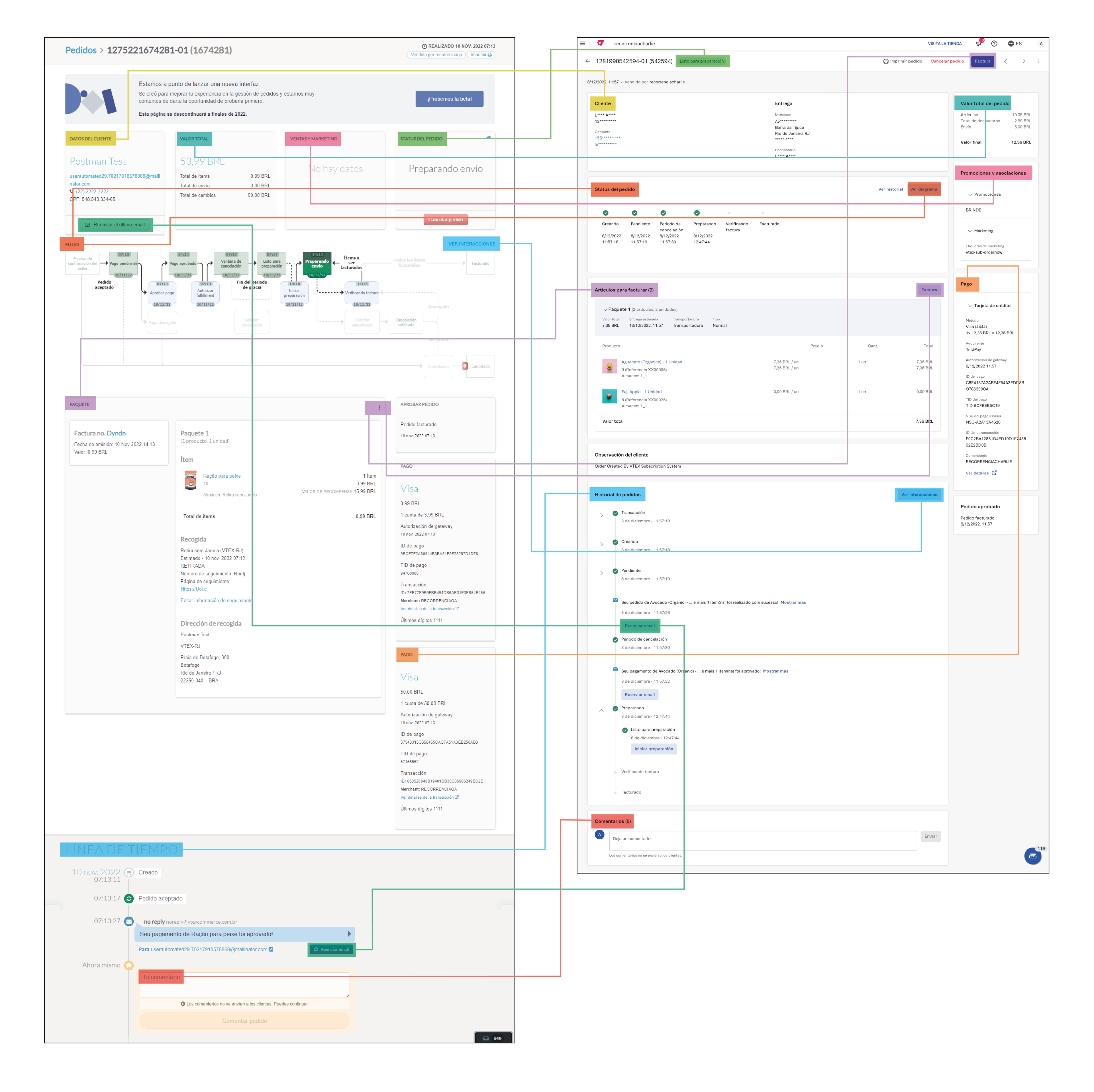 En la imagen a continuación, puedes ver la correspondencia de secciones y campos entre la versión antigua de la página Detalles del pedido y la nueva versión: