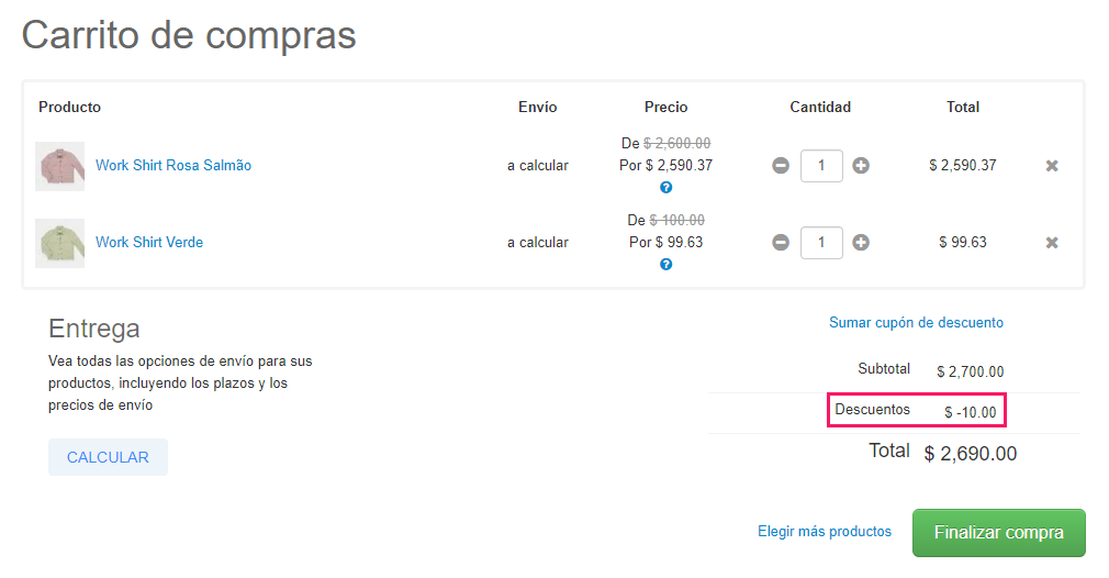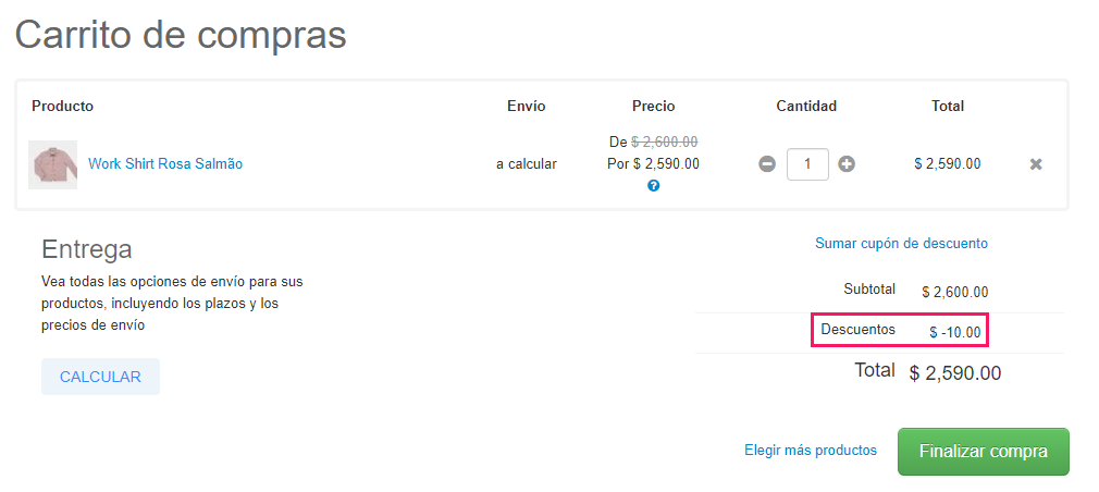 De esta manera, la promoción aplicará el valor de descuento más bajo en cada caso y comparará el cálculo del 20% del total con el valor límite de $ 10. En los escenarios que se muestran a continuación, podrás ver la aplicación práctica de esta promoción.