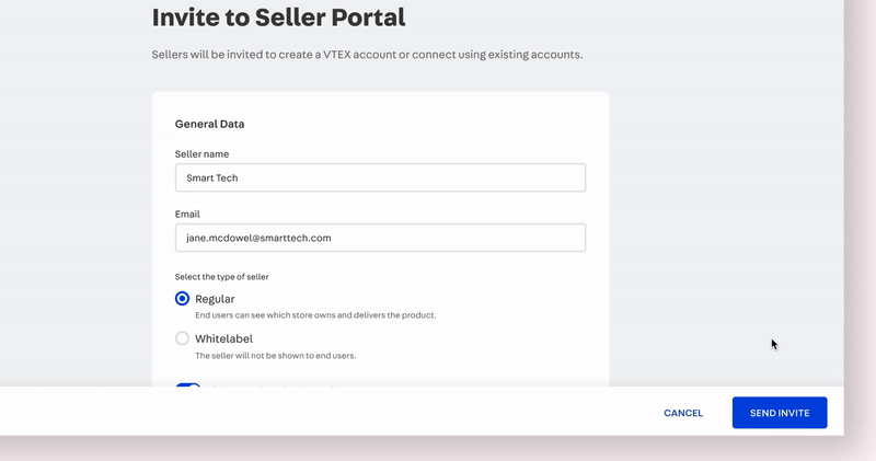 La página de Invitación de Sellers es donde los operadores del marketplace invitan a los sellers a crear una cuenta en el Seller Portal. Puedes acceder a la página desde el Admin VTEX, en MARKETPLACE > Sellers > Invitación de Sellers.