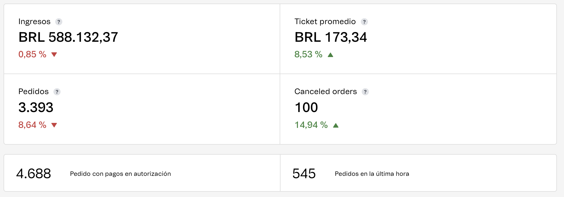 | Pedidos con pago en autorización | Pedidos que no se han realizado por problemas de autorización de pago. Al hacer clic en esta métrica, se te redirige a la página Transacciones para que revises las autorizaciones de pago pendientes. |