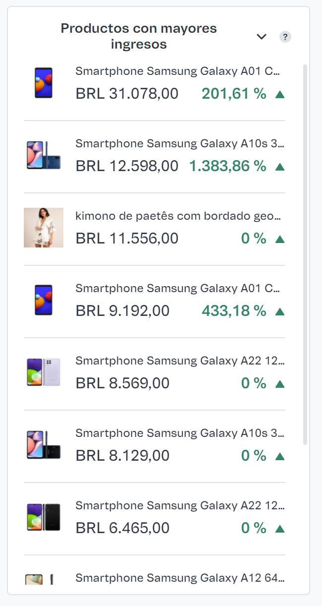 - Productos con mayores ingresos: los productos que han generado los mayores ingresos en el periodo seleccionado. Indica el valor recibido en ingresos y un porcentaje que muestra el aumento o la disminución en los ingresos, comparando los periodos seleccionados.