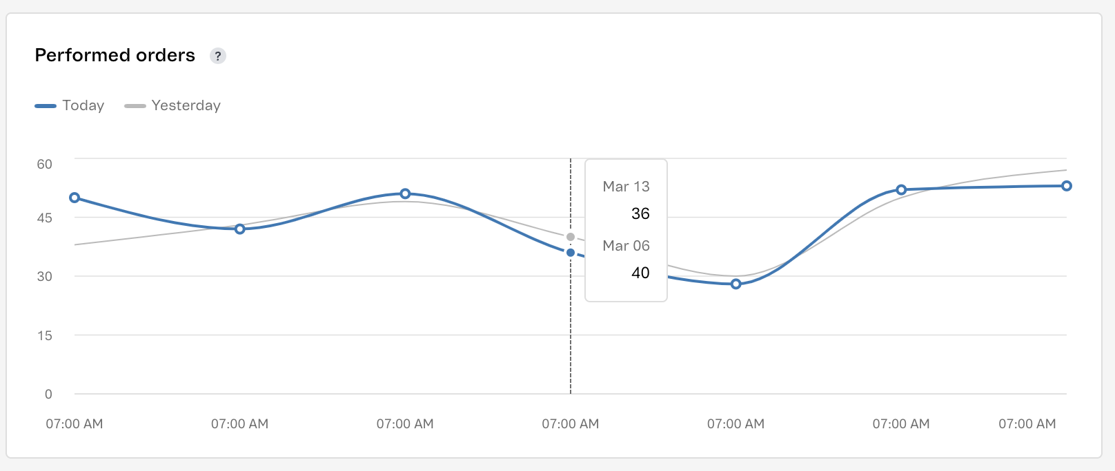 El número que aparece en la parte superior del gráfico se refiere a los pedidos realizados en la última hora y se actualiza cada cinco minutos. La etiqueta que aparece en la parte superior del gráfico indica si los pedidos se están realizando a un ritmo normal, bajo o alto en comparación con el desempeño habitual de tu tienda para ese periodo.