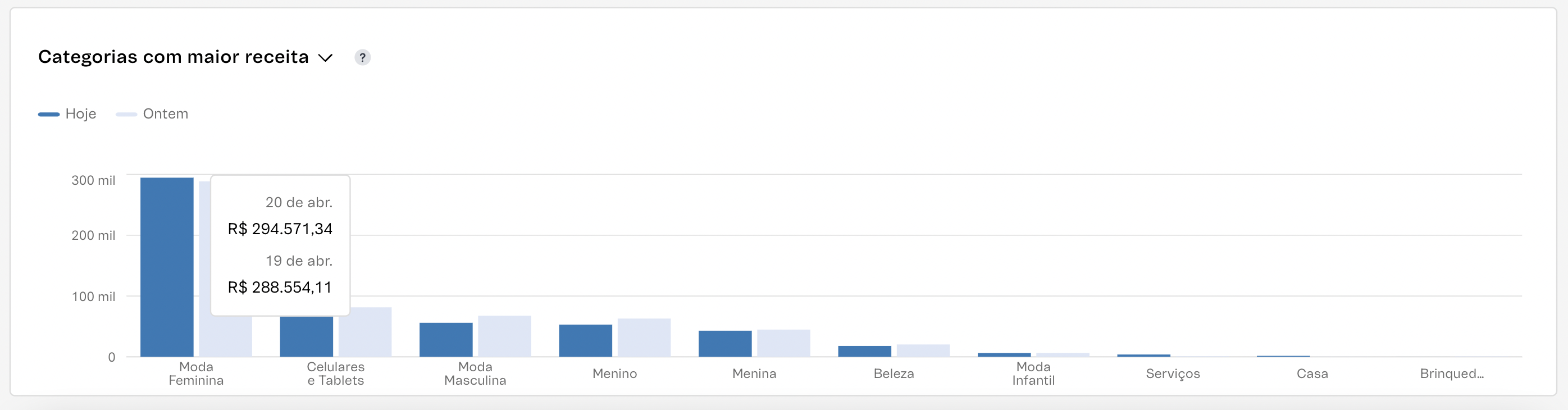 Este gráfico muestra las diez categorías de tu tienda que más ingresos generaron en el periodo seleccionado. La barra azul indica los ingresos generados en la fecha más reciente y la barra gris indica los ingresos generados en el periodo comparado. Al pasar el mouse sobre el gráfico, se visualiza la tasa de conversión para cada periodo comparado. Al hacer clic en el título del gráfico, es posible cambiar la vista a las Categorías más vendidas por pedido.