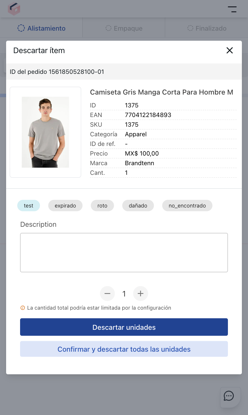 Descartar unidadespara la cantidad seleccionada o haz clic enConfirmar y descartar todas las unidadespara rechazar todos los ítems.