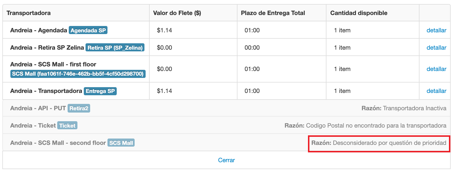 En este caso, el módulo de logística ha descartado los demás puntos de recogida mediante su algoritmo de priorización. Durante este proceso, solo se presenta al cliente uno de los métodos de envío con el mismo nombre. Sepa más en este artículo sobre las divergencias entre políticas de envío.