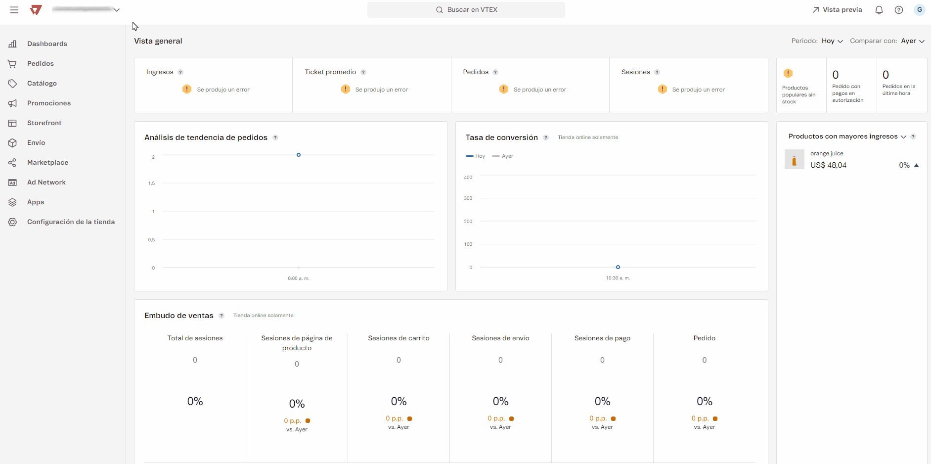 Una vez que accedas al Admin, verás métricas y gráficos útiles para monitorear el desempeño de tu tienda, como los ingresos generados y el número de pedidos, el embudo de ventas y la tasa de conversión, así como los 10 productos que más ingresos generan.