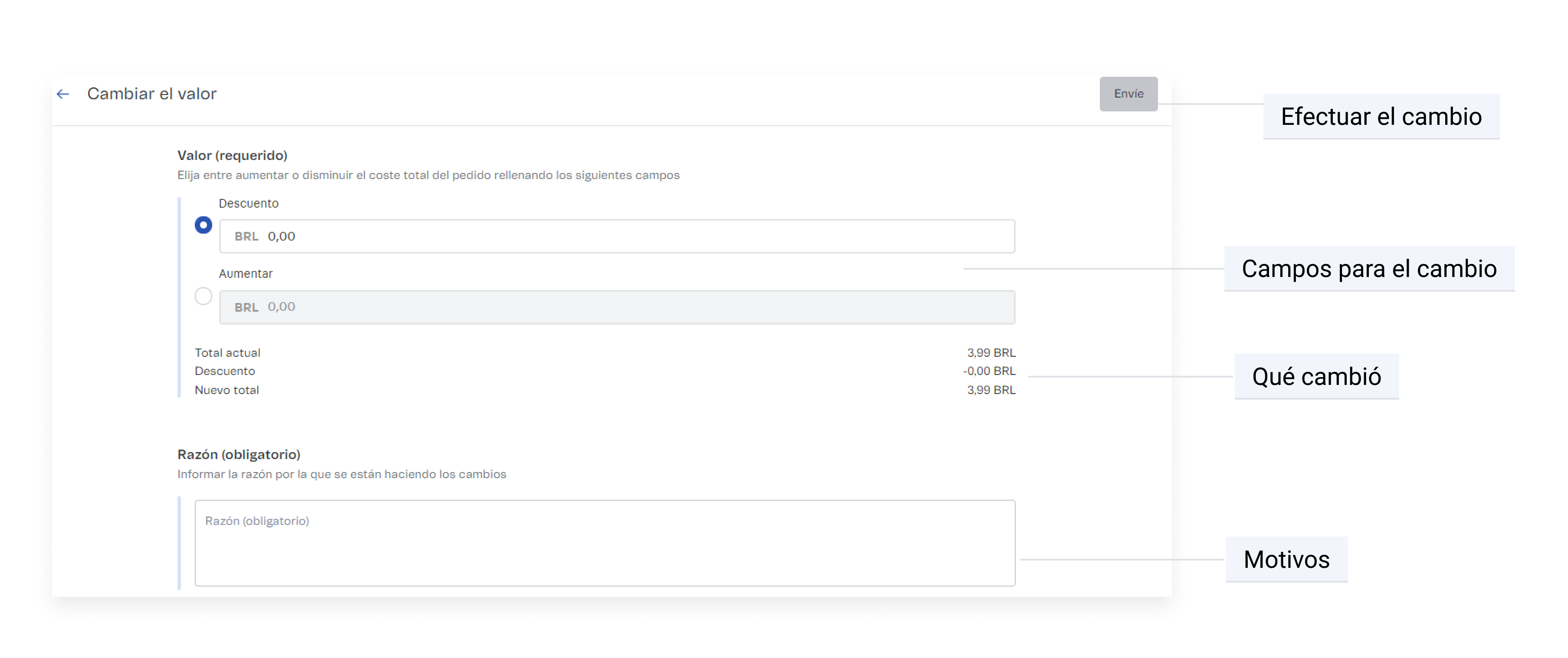 La página Detalles del pedido permite modificar el valor final del pedido para los pedidos que aún no han sido facturados. Esto ocurre en los escenarios en los que hay descuentos o adiciones al valor.