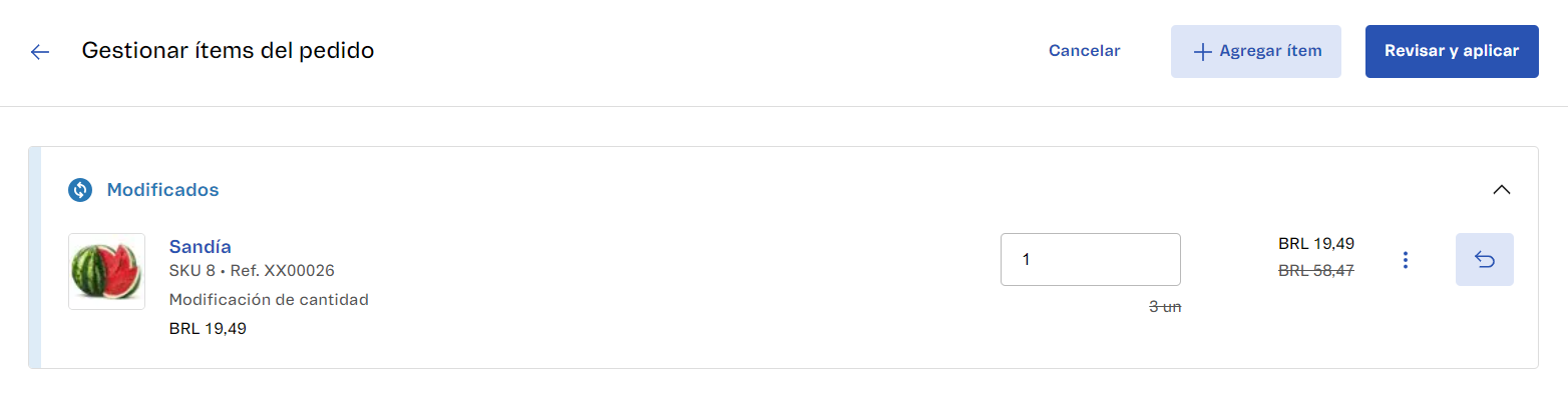 En la página Gestionar ítems del pedido, puedes deshacer las modificaciones si así lo deseas. Haz clic en el ícono de flecha curva Deshacer acción. Una vez hecho esto, aparecerá un mensaje de confirmación: "Modificación deshecha", y la acción se habrá revertido.