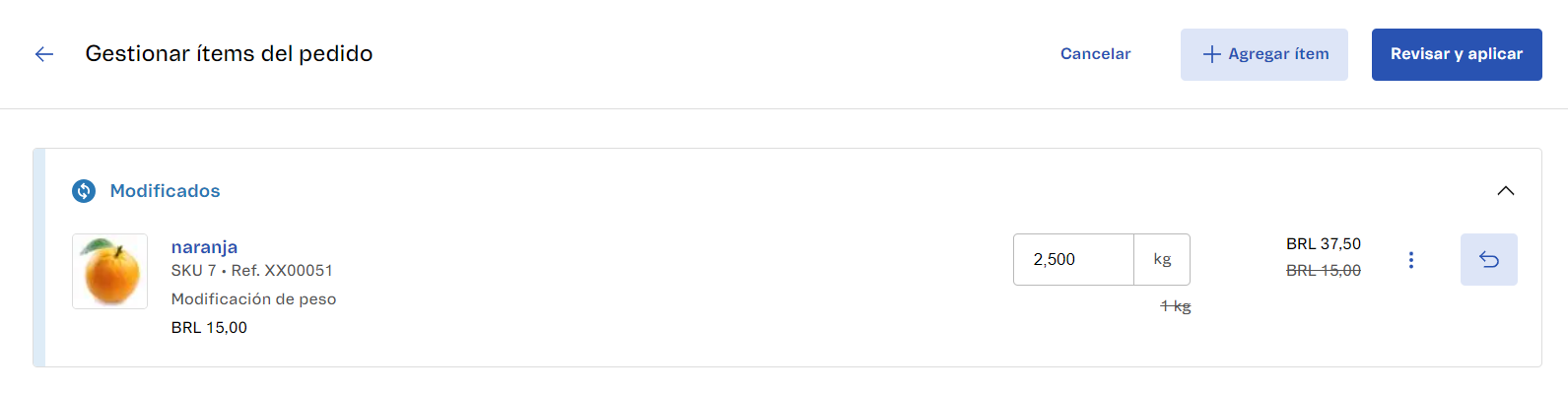 En la página Gestionar ítems del pedido, en la fila del producto deseado, ingresa el nuevo peso en el campo. La unidad de medida especificada se basa en los ajustes del Catálogo.