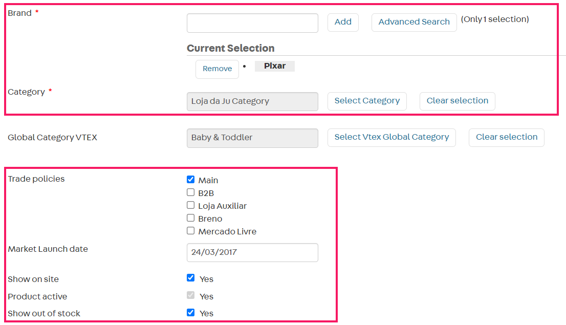 • Trade policies: Check if the product is associated with a trade policy. If it's not, use the selection box to choose the trade policy with which you want to associate it.