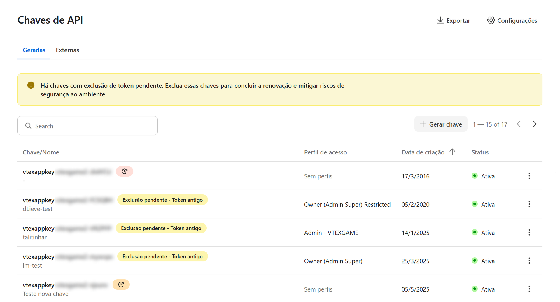 Exportação de chaves de API: agora você pode gerar um arquivo XLSX com informações das chaves de API geradas na conta e chaves externas.