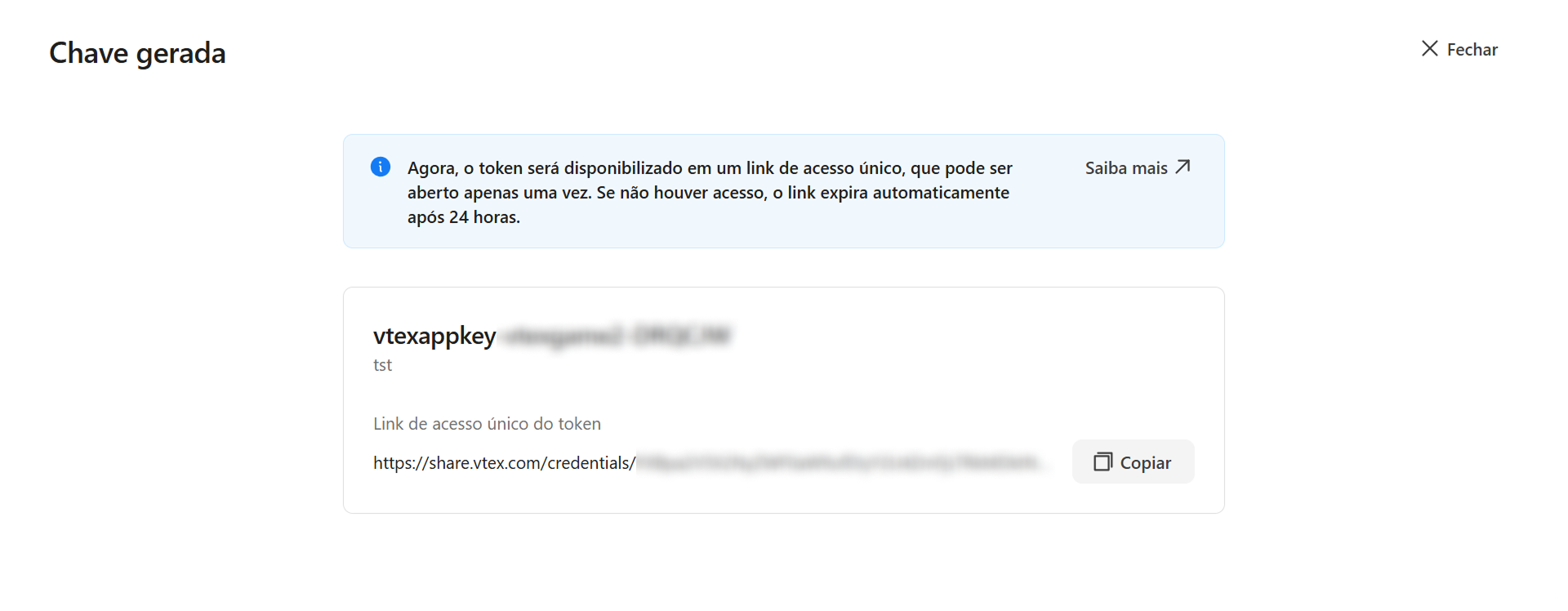 share.vtex.com/credentials/{token}. O{token}é um identificador aleatório gerado no momento da criação ou renovação da chave. Verifique o formato do link antes de acessá-lo para evitar riscos de phishing ou acesso a páginas maliciosas.