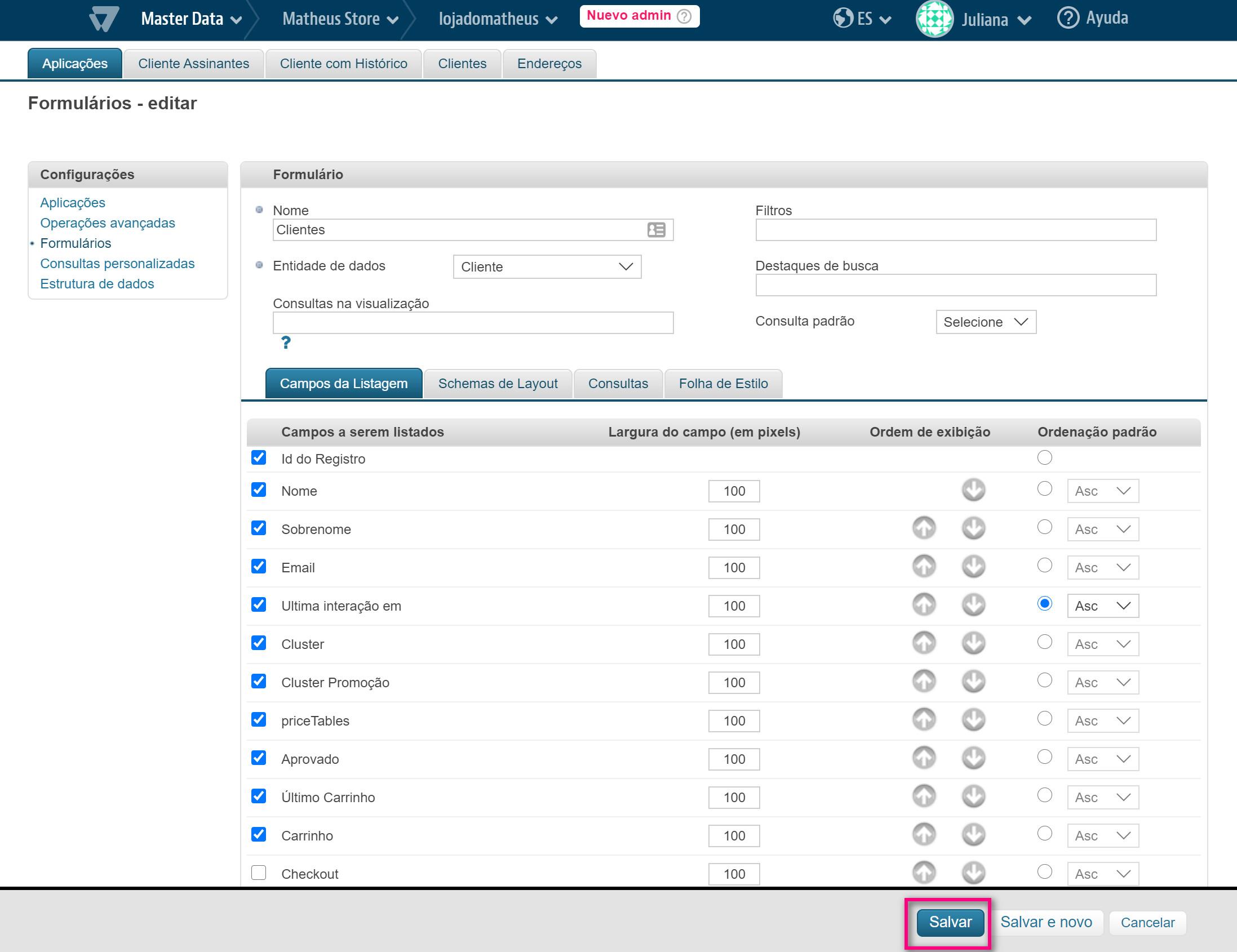 - Selecione as opções “Último carrinho” e “Carrinho” dentre as opções de Campos de Listagens