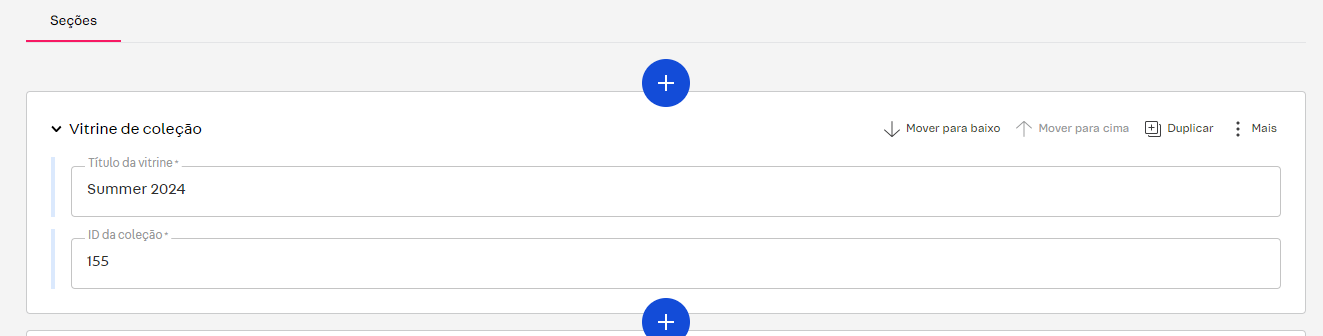 - Vitrine de coleção: exibirá produtos da coleção que você definir. Adicione as seguintes informações: Título da vitrine: nome da vitrine que será exibido na página. ID da coleção: número do identificador da coleção que será exibido na página.
