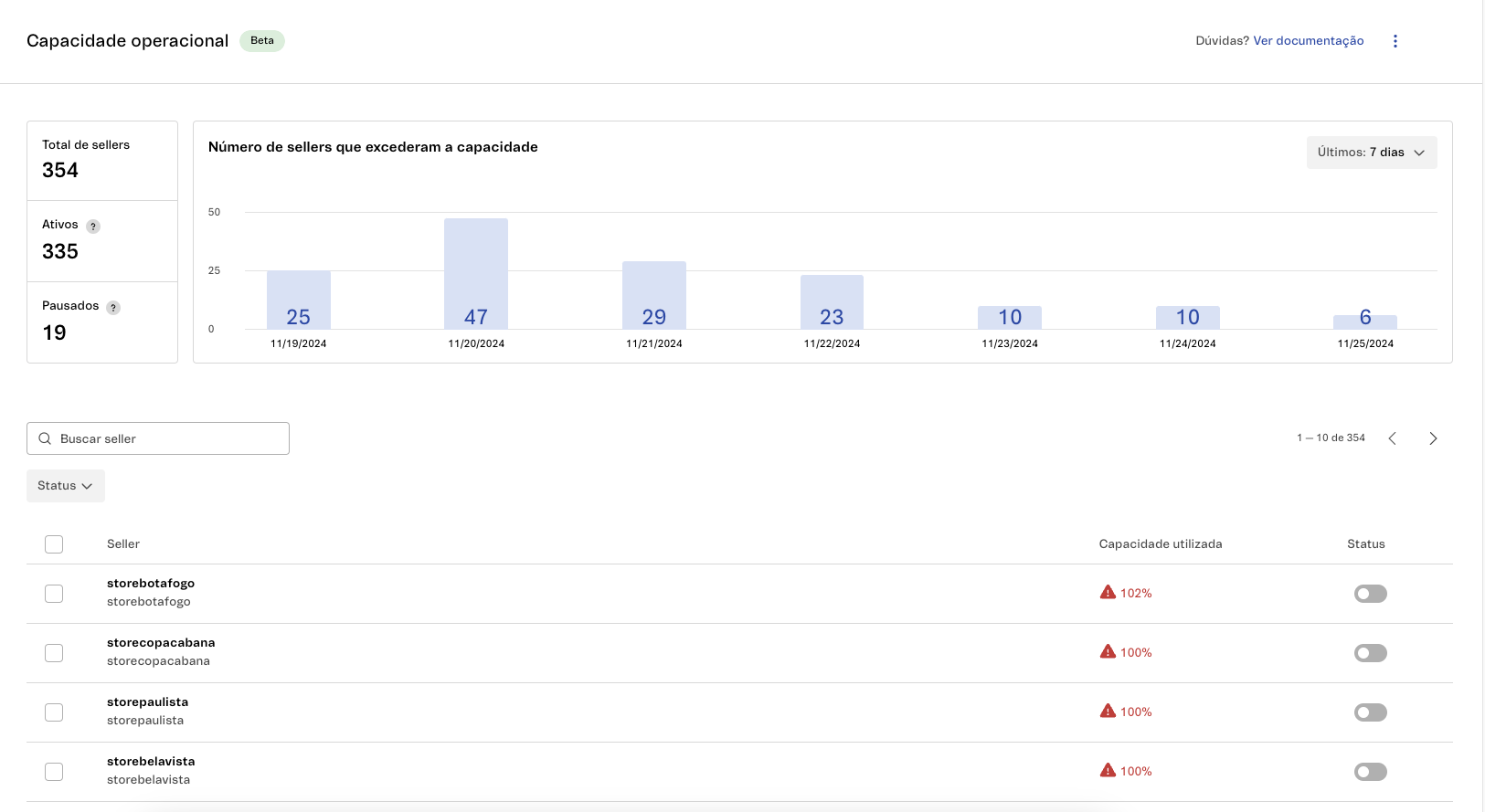 - Ativos: quantidade de sellers que estão recebendo novos pedidos, sejam sellers com um limite de capacidade configurado ou com capacidade ilimitada.