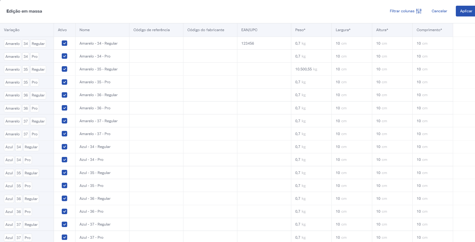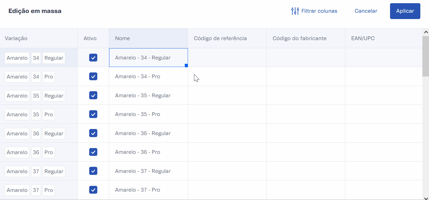 Edição em massapara abrir a planilha de edição de variações. - Para editar uma informação da planilha, clique no campo que deseja alterar.