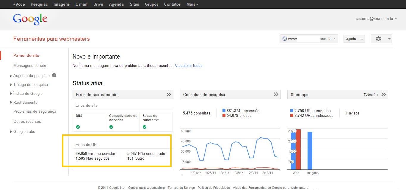 Você poderá incluir esses links na planilha, fazendo referência à Home, ou coleção, o que for mais adequado à sua loja. Após a correção desses links você precisará voltar ao Web Master Tools, clicar em Rastreamento e depois em Erros de Rastreamentos.